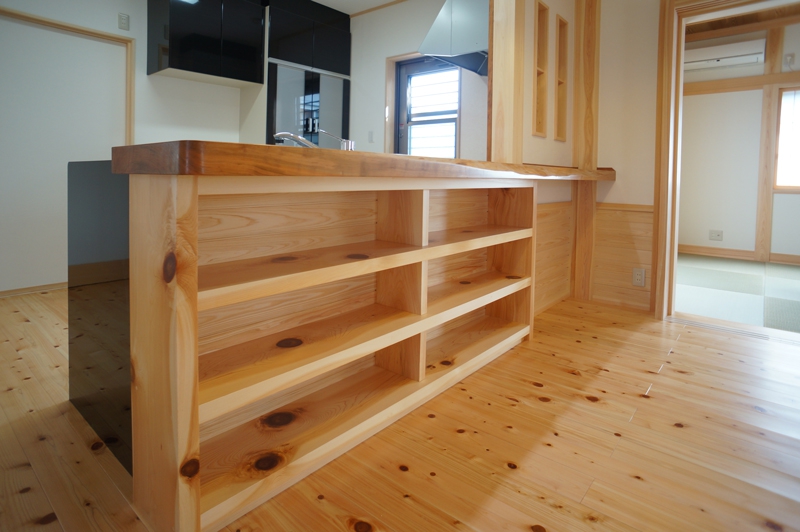 - キッチンカウンターは国産の桜一枚板でお作り致しました