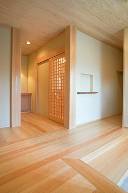 天井部分の殆どに杉板を使用、壁は珪藻土仕上げ