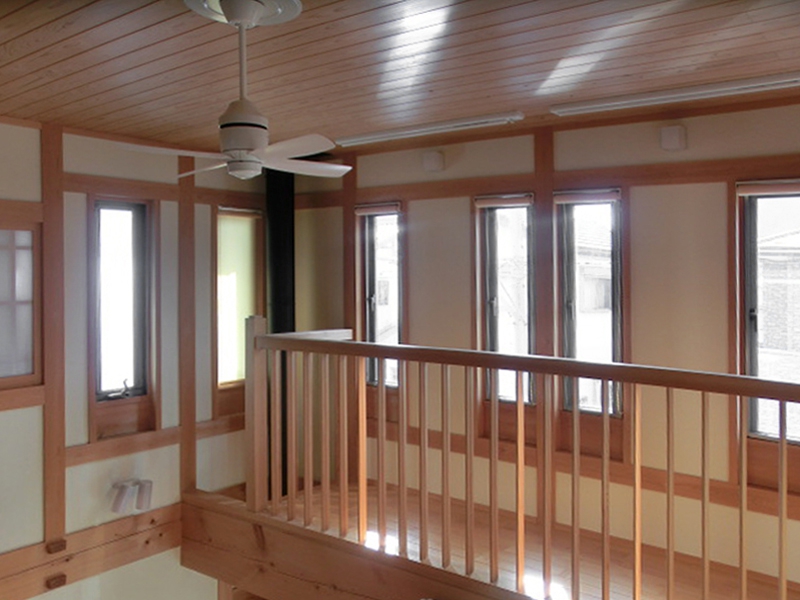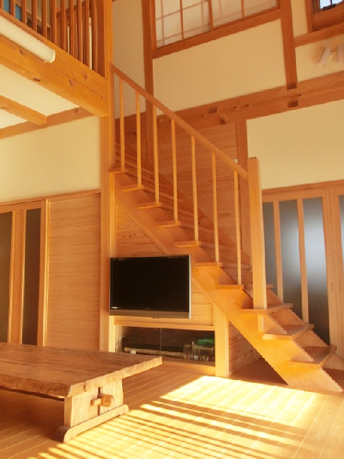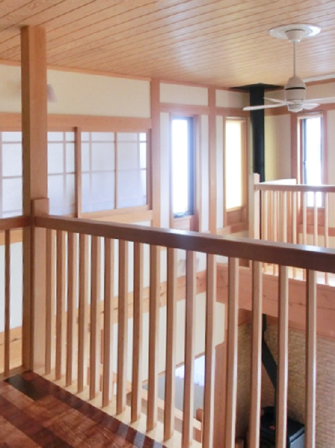 家の中心に暖炉を設置し2階部も効率よく暖まるように吹き抜けになっています